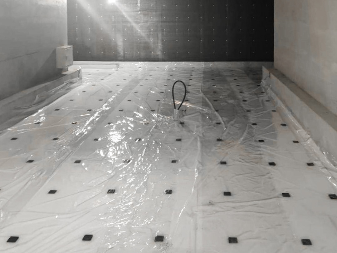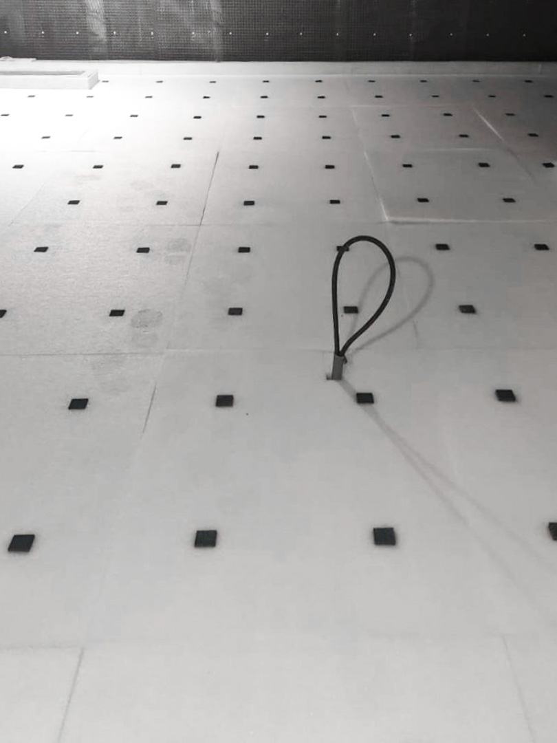 本公司所使用的高效能浮式隔振地板為改良式新型浮動地板,利用EPE材質的耐水性及避振塊防震效果防止振動直接傳導結構體,施工上更為簡易,而效能更加能夠防止共振的產生。